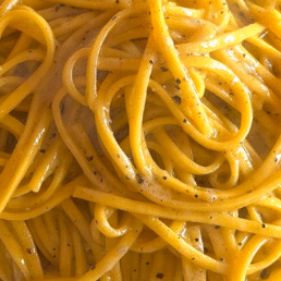 Kantarellpasta med fläsk, vitt vin, persilja och timjan.