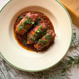 Termen "Braciole" kommer från det italienska ordet "braciola", som betyder “skiva”. Det handlar om tunt skivat kalvkött som rullas med...